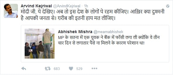 अरविंद केजरीवाल ने किसी का ट्वीट, रिट्वीट किया. उसमें ये लिखा था कि युवक ने बैंक से पैसे न निकलने के कारण दुखी होकर फांसी लगा ली. केजरीवाल ने लिखा. 'मोदी जी, ये देखिए. अब तो इस देश के लोगों पे रहम कीजिए. आख़िर क्या दुश्मनी है आपकी जनता से. ग़रीब की इतनी हाय मत लीजिए.' बाद में ट्वीट सही नहीं निकला.