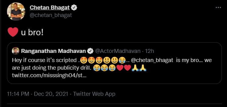 हां बिलकुल ये स्क्रिप्टेड है... चेतन मेरा भाई है. हम तो पब्लिसिटी ड्रिल कर रहे हैं.माधवन के इस ट्वीट पर चेतन ने लिखा,