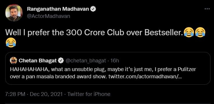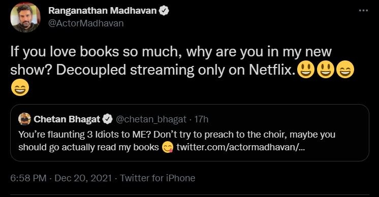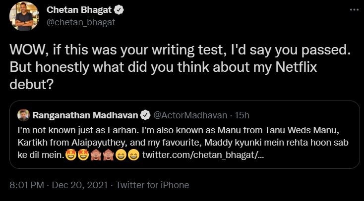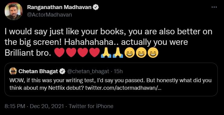 मैं ये कहूंगा आपकी किताबों की तरह आप भी बड़ी स्क्रीन पर ज्यादा अच्छे लगते हैं. असल में आप शो में कमाल थे भाई.माधवन-चेतन के इस बैंटर पर कुछ लोग माधवन को टैग करके लिखने लगे कि ये सब तो स्क्रिप्टेड है. इस पर माधवन ने कहा,