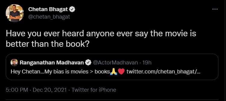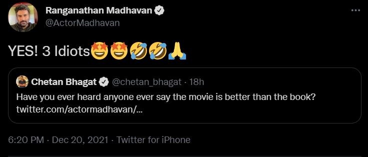 क्या आपने कभी किसी को ये कहते हुए सुना है कि कोई फिल्म किताब से बेहतर थी?इस पर चुटकी लेते हुए माधवन ने लिखा,