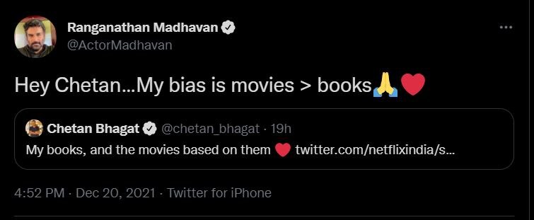 मेरी किताबें और उन पर बनी फ़िल्में.इस पर माधवन ने चेतन की ट्वीट को कोट करते हुए जो लिखा, उसका मतलब था...