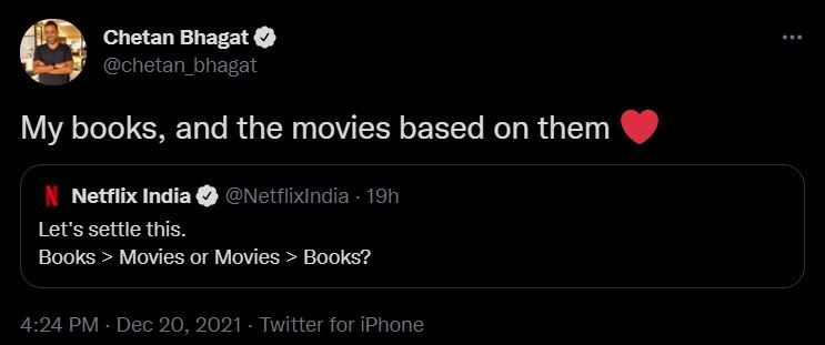 बुक्स >मूवीज़> बुक्स ?इन शॉर्ट नेटफ्लिक्स वाले किताबें ज़्यादा अच्छी होती हैं या फ़िल्में, इस बात की रायशुमारी कर रहे थे. इस सवाल पर चेतन भगत ने लिखा,