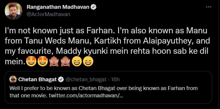 मैं सिर्फ़ फ़रहान के नाम से नहीं जाना जाता हूं. मैं 'तनु और मनु' के मनु के नाम से भी जाना जाता हूं. 'अलैपयुदे' के कार्तिक के नाम से भी जाना जाता हूं. और मेरे फ़ेवरेट मैडी के नाम से भी. क्योंकि मैं रहता हूं सब के दिल में.जवाब पाकर चेतन ने लिखा,
