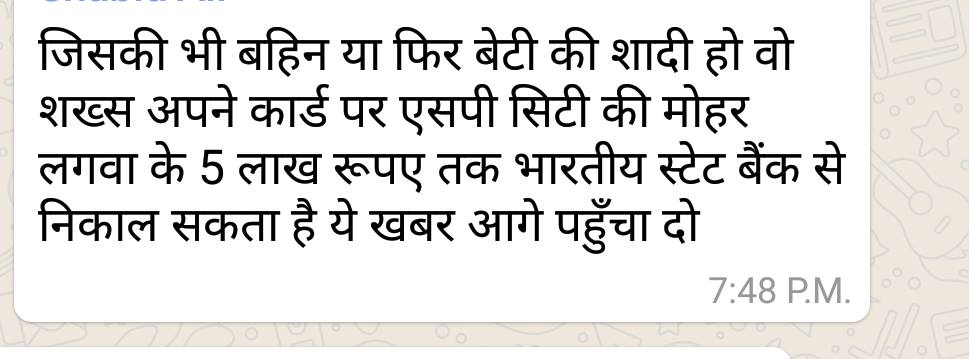 मेरे पास व्हाट्सएप पर एक मैसेज और वो मैसेज कई ग्रुप में आया. मैसेज में लिखा है कि जिनके घर में शादी है. वे शादी के कार्ड पर अपने एरिया के डीसीपी से मुहर लगवाकर RBI से 5 लाख रुपये निकाल सकते हैं. यह अफवाह इस हद तक फैली कि पुलिस अफसरों को लोग कॉल कर करके पैसों की बात करने लगे. जब हमने पता किया तो जानकारी मिली ये कोरी अफवाह है. तो प्लीज इस मैसेज को फैलने से रोकें. वो इसलिए कि RBI किसी को पैसा नहीं देता. वो तो बाकी बैंको पर कंट्रोल करता है. बेवक़ूफ़ न बनो.