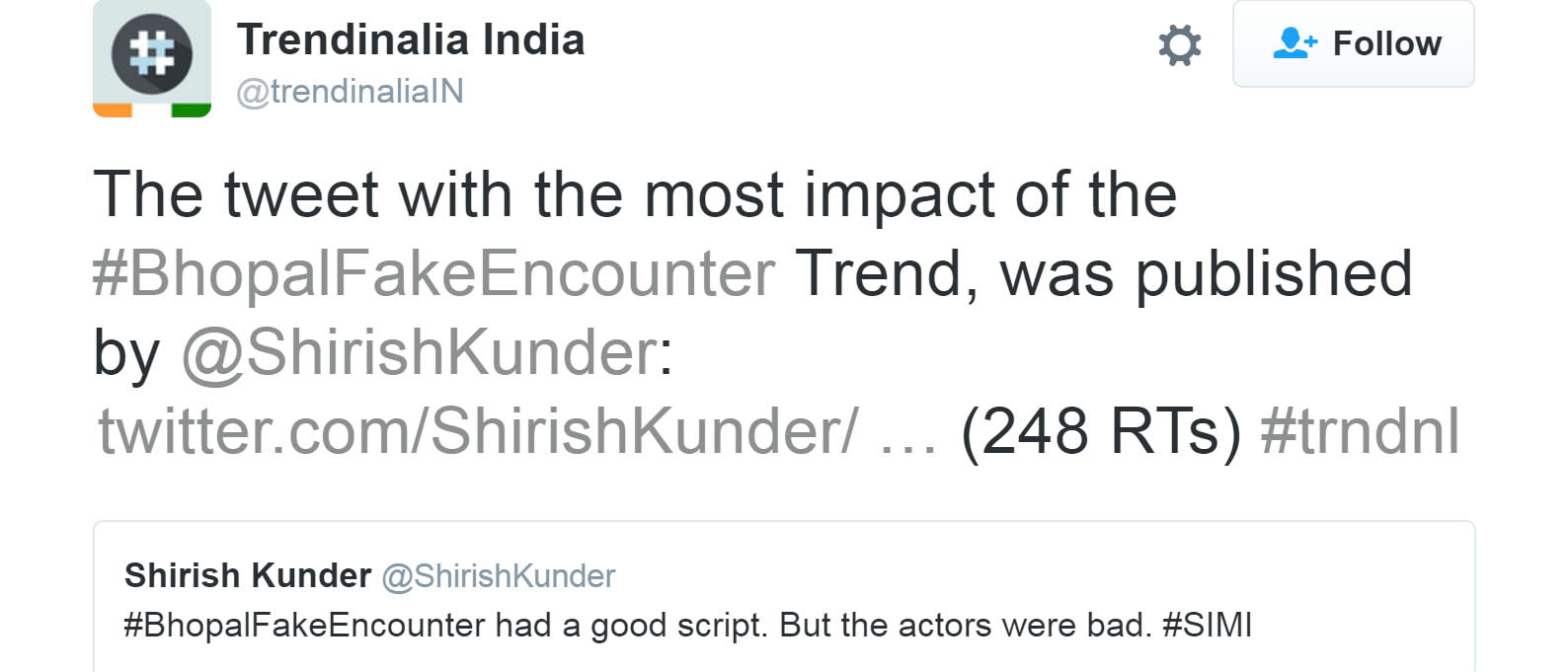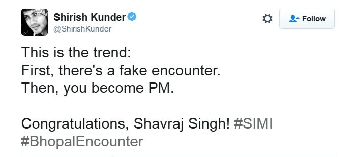 सोमवार को भोपाल एनकाउंटर वाले पूरे घटनाक्रम के दौरान भी वे एक के बाद एक स्ट्रोक लगा रहे थे. इतना कि #BhopalFakeEncounter हैशटैग वाले ट्रेंड में उनका ट्वीट सबसे ज्यादा असरदार घोषित किया गया. उन्होंने लिखा था, "भोपाल फेक एनकाउंटर की स्क्रिप्ट बहुत बढ़िया थी. लेकिन एक्टर बहुत बुरे थे."