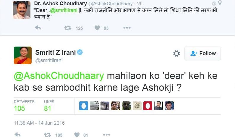 पिछले दिनों बिहार के शिक्षा मंत्री अशोक चौधरी से स्मृति ईरानी की ट्विटर पर बहस हो गई. अशोक ने कहा, 'डिअर स्मृति जी, राजनीति और भाषण से टाइम मिले, तो शिक्षा नीति की तरफ भी ध्यान दीजिये.' स्मृति ने सट्ट से जवाब दिया, 'अशोक जी, आप महिलाओं को डिअर कहकर कबसे संबोधित करने लगे?' बस इतना हुआ, और ट्विटर पर बवाल छिड़ गया.