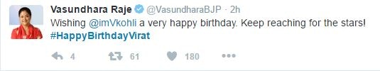 5. राजस्थान की मुख्यमंत्री वसुन्धरा राजे ने भी कोहली को बधाई दी.6. फैन्स ने भी अपने तरीके से कोहली का बड्डे मनाया.