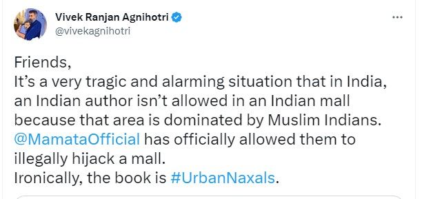 “दोस्तों यह एक बेहद दुखद और चिंताजनक स्थिति है कि भारत में एक भारतीय लेखक को भारतीय मॉल में जाने की अनुमति नहीं है. क्योंकि उस क्षेत्र में मुस्लिम भारतीयों की आबादी ज्यादा है. ममता बनर्जी ने आधिकारिक तौर पर इन लोगों को एक मॉल को अवैध रूप से हाईजैक करने की अनुमति दी है. लेकिन विडंबना यह है कि किताब ‘अर्बन नक्सल्स’ है.”