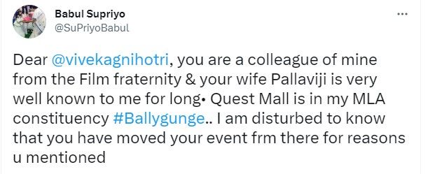 “प्रिय विवेक अग्निहोत्री, आप फिल्म बिरादरी से मेरे एक सहयोगी हैं और आपकी पत्नी पल्लवी जी मुझे लंबे समय से से जानती हैं. क्वेस्ट मॉल मेरे विधायक निर्वाचन क्षेत्र बालीगंज में आता है. मैं यह जानकर परेशान हूं कि आपने जो कारण बताए उनकी वजह से आपने अपने इवेंट की जगह बदल ली.”