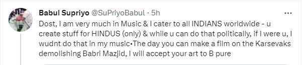इसके बाद बाबुल सुप्रियो ने विवेक अग्निहोत्री पर तंज कसते हुए जवाब दिया. उन्होंने लिखा,