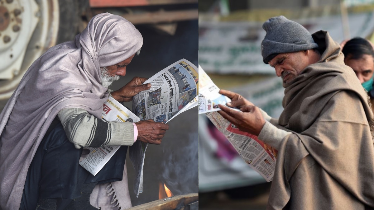अखबार पढ़कर खबरों की जानकारी लेते किसान. फोटो- PTI