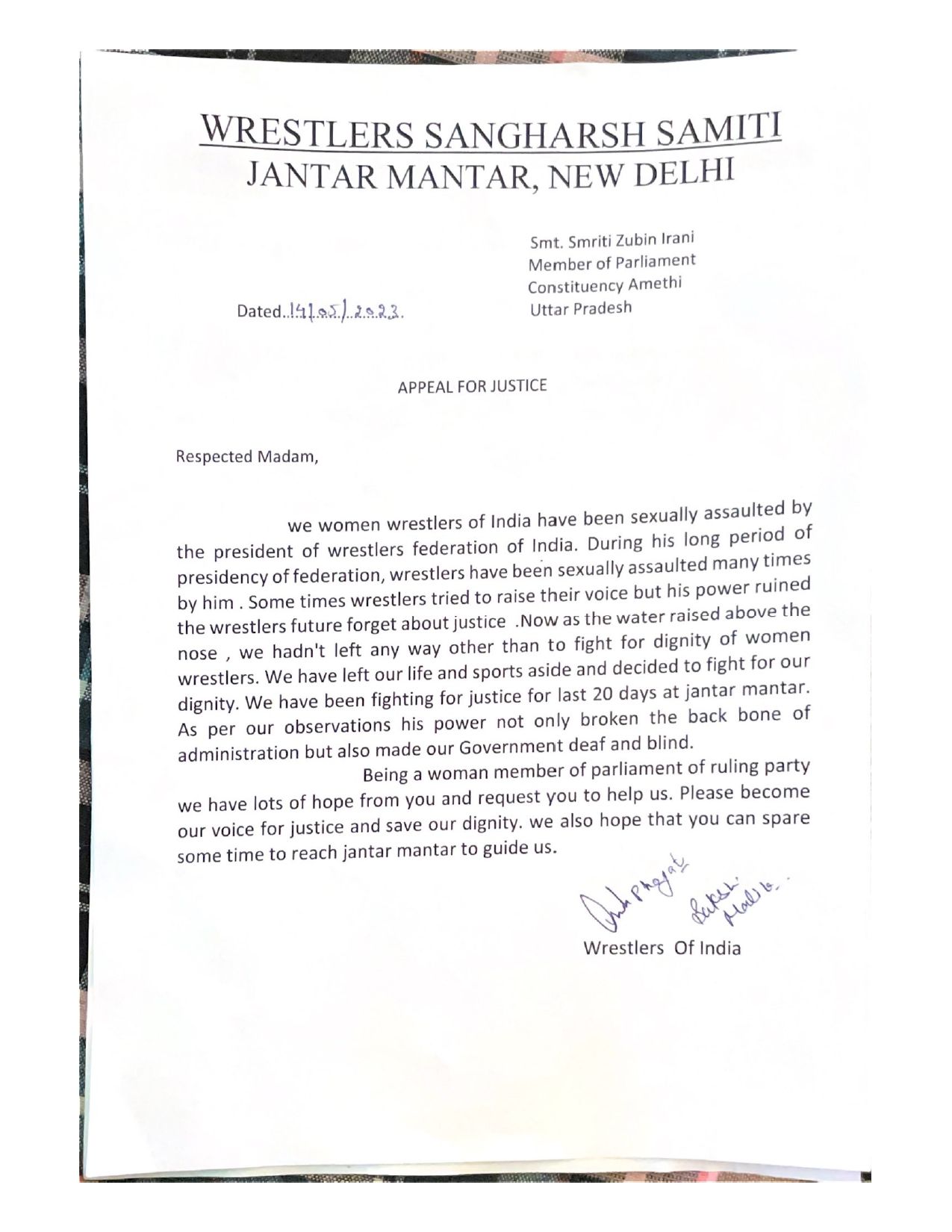 दिल्ली के जंतर मंतर पर धरने पर बैठी महिला पहलवानों ने अब मोदी सरकार में महिला और बाल विकास मंत्री स्मृति ईरानी को एक पत्र लिखा है. इस पत्र में महिलाओं ने स्मृति से न्याय में मदद करने की मांग की है. लिखा -