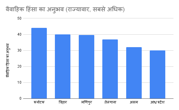 राष्ट्रीय परिवार स्वास्थ्य सर्वेक्षण के मुताबिक कर्नाटक में 44% शादीशुदा महिलाओं ने हिंसा का अनुभव किया है. इसके बाद बिहार (40%), मणिपुर (39.6), तेलंगाना (36.9), असम (32%) और आंध्र प्रदेश (30%) का स्थान है.