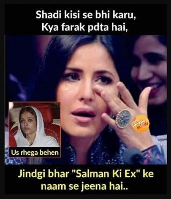 सबसे पहले आप ये तस्वीर देखिए. फेसबुक पर ये बहुत वायरल है. कटरीना की रोती हुई तस्वीर के साथ किसी ने लिखा, " शादी किसी से भी करूं, क्या फर्क पड़ता है. कहलाउंगी तो सलमान की एक्स ही." तस्वीर में किनारे ऐश्र्वर्या की भी फोटो है जिसपर लिखा है, "Us रहेगा बहन." मतलब हम दोनों का यही हाल है.