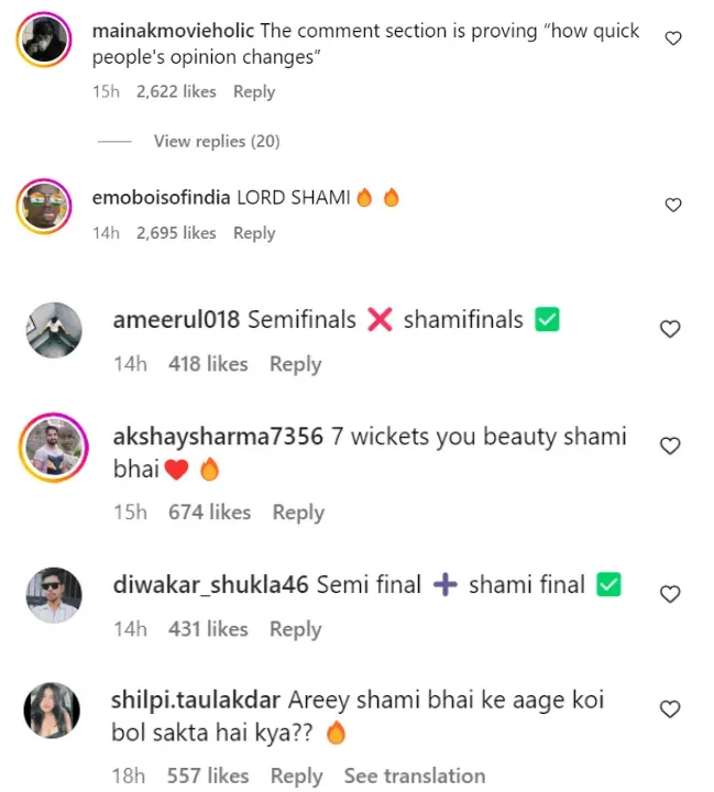 दूसरे यूजर्स ने भी शमी के लिए प्यार बरसाया. किसी ने लॉर्ड शमी लिखा तो कुछ ने सेमीफाइनल को ‘शमीफाइनल’ बता दिया. shilpi.tualakdar नाम की यूजर ने लिखा,