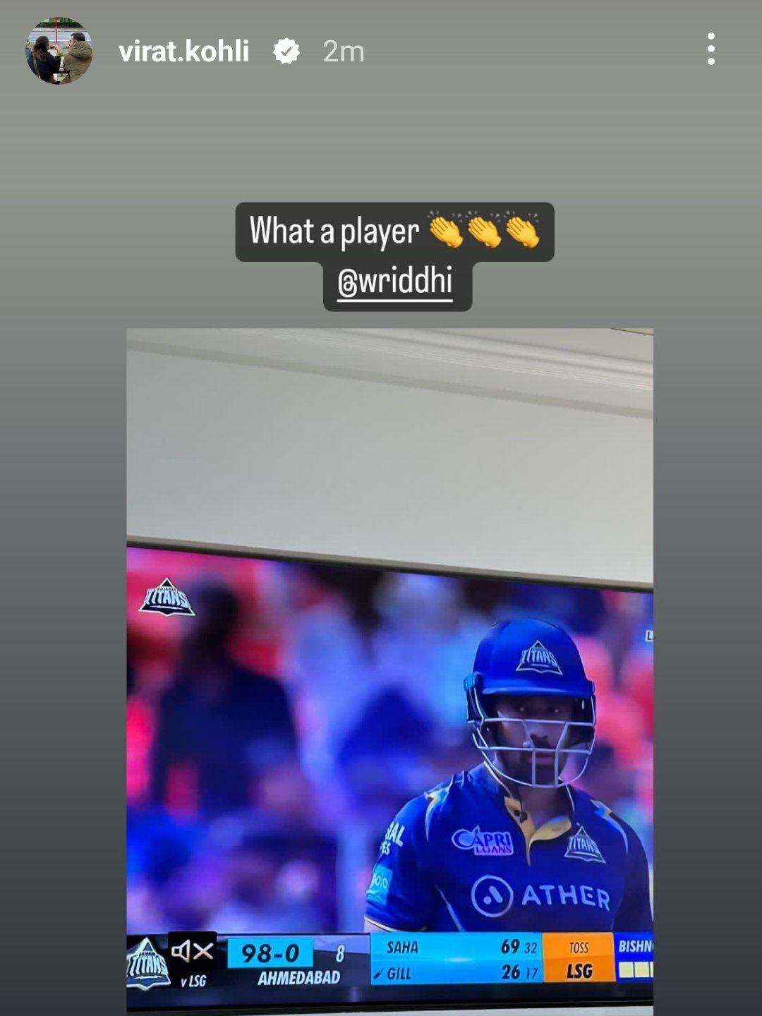 गुजरात का स्कोर आठ ओवर में 98 रन था. और तभी कोहली ने साहा की एक फोटो के साथ स्टोरी लगाई. और साहा को टैग करते हुए लिखा,