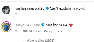 उनके पोस्ट पर सूर्यकुमार यादव ने तुरंत ही मजेदार कॉमेंट किया. उन्होंने यशस्वी के मजे लेते हुए जवाब दिया,