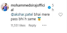 अक्षर के इस कमेंट पर मोहम्मद सिराज ने भी रिप्लाई किया. उन्होंने लिखा,