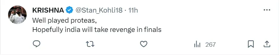 “साउथ अफ्रका ने अच्छा खेला. फाइनल में भारत आपका बदला लेगी.”