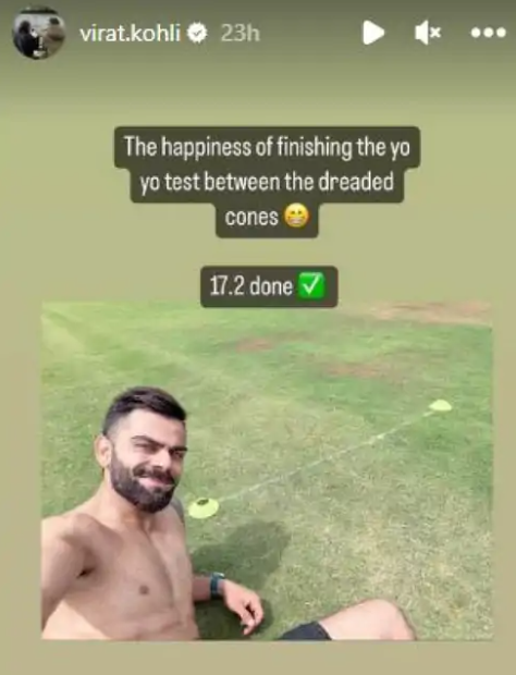 एशिया कप 2023 से पहले BCCI ने अलुर में एक ट्रेनिंग कैंप रखा. इस कैंप में प्लेयर्स का यो-यो टेस्ट हुआ. के मुताबिक BCCI ने फिट घोषित करने के लिए न्यूनतम स्कोर 16.5 रखा था. विराट ने इस टेस्ट में 17.2 का स्कोर बनाया. उन्होंने इसके बारे में इंस्टाग्राम पर एक स्टोरी लगाकर बताया.रिपोर्ट्स